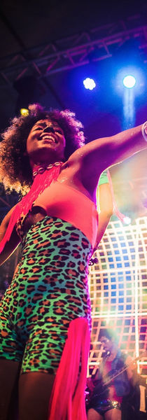 Member of the collective, block and band, she acts as a creative dancer, choreographer, movement director, one of the creators of the onçatic movement and communication manager (social networks) for the Amigos da Onça brand.